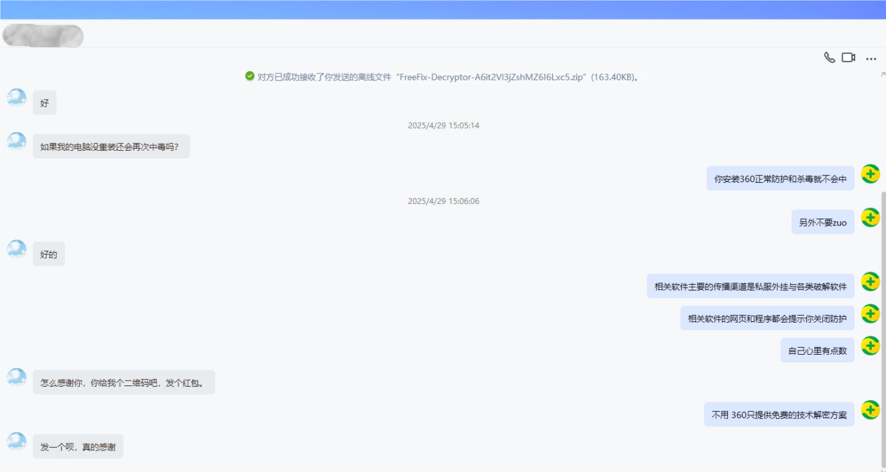 该用户通过勒索反馈群联系我们,我们的技术人员快速进行对接,仅用十几分钟就恢复了被加密文件。激动的用户当即表示要给我们发红包以示感谢,但我们秉持着“永久免费”的工作准则,婉言谢绝了用户的美意。