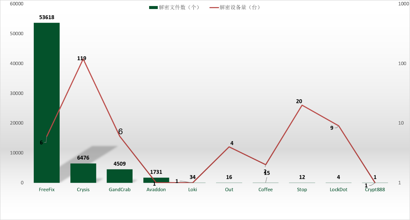 从解密大师本月解密数据看,解密量最大的是FreeFix其次是Crysis。使用解密大师解密文件的用户数量最高的是被Crysis家族加密的设备。