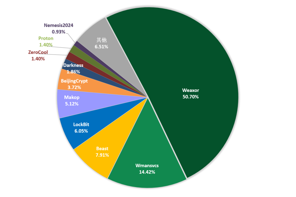 本月勒索软件受害者设备所中病毒家族进行统计:Weaxor家族占比50.70%居首位,第二的是Wmansvcs占比14.42%,Beast家族以7.91%位居第三。
